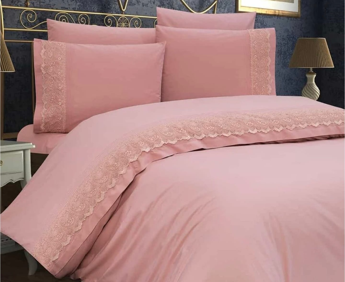 Set Lenjerie Bumbac Damasc Cu Broderie Lux Roz – 4 Piese